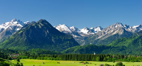 Dorfromantik pur: Glitzernder Schnee auf den stillen, weiten Wiesen um Oberstdorf, frostige Tannen mit kleinen Schneehäubchen, strahlender Sonnenschein, der die Gipfel der imposanten weißen Berge berührt und die kalte, klare Luft, die Ihre Lunge füllt.